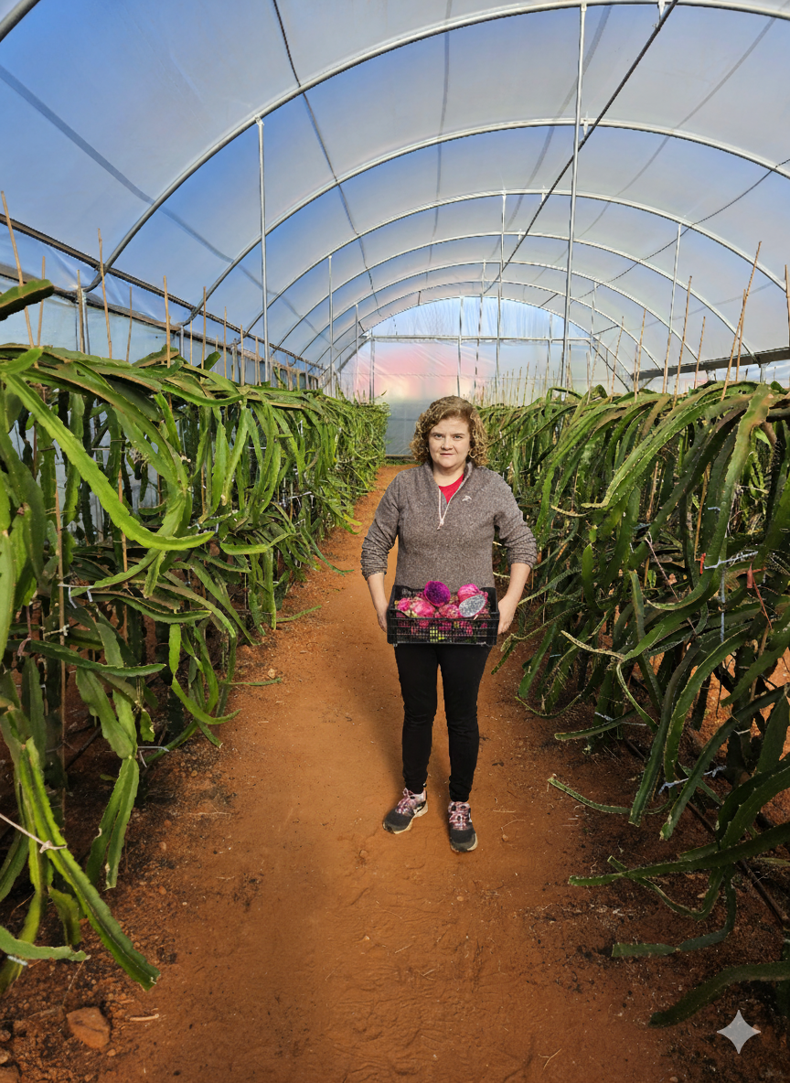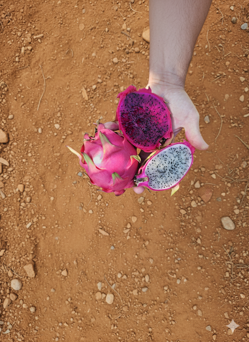 Nuestra compañera Lalo cultiva la Fruta del Dragón en la región de Valencia. Una variedad tropical llamativa y llena de carácter, apreciada por su sabor suave y refrescante. Su piel es de un rosa vibrante con escamas verdes, mientras que en su interior sorprende con una pulpa blanca salpicada de pequeñas semillas negras.